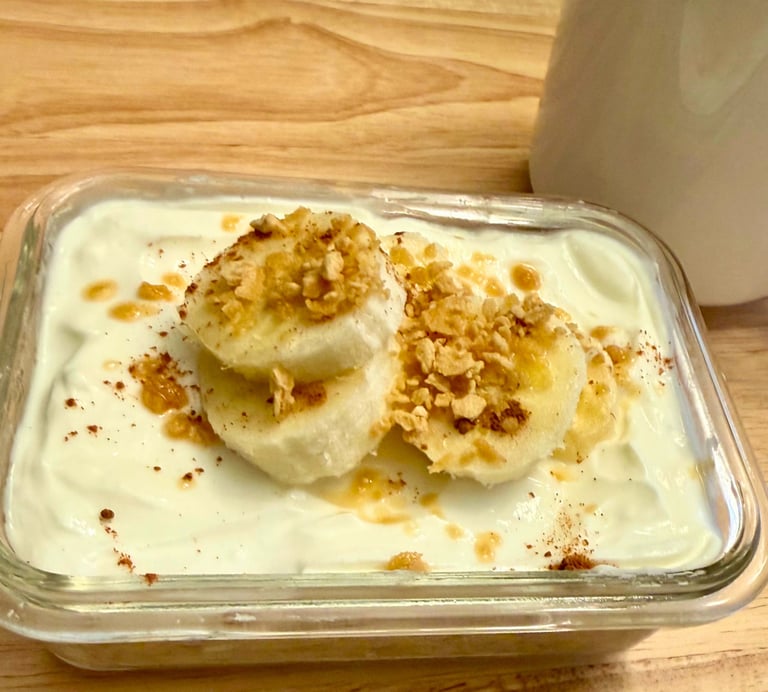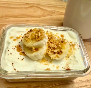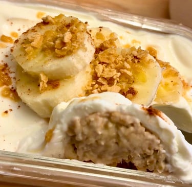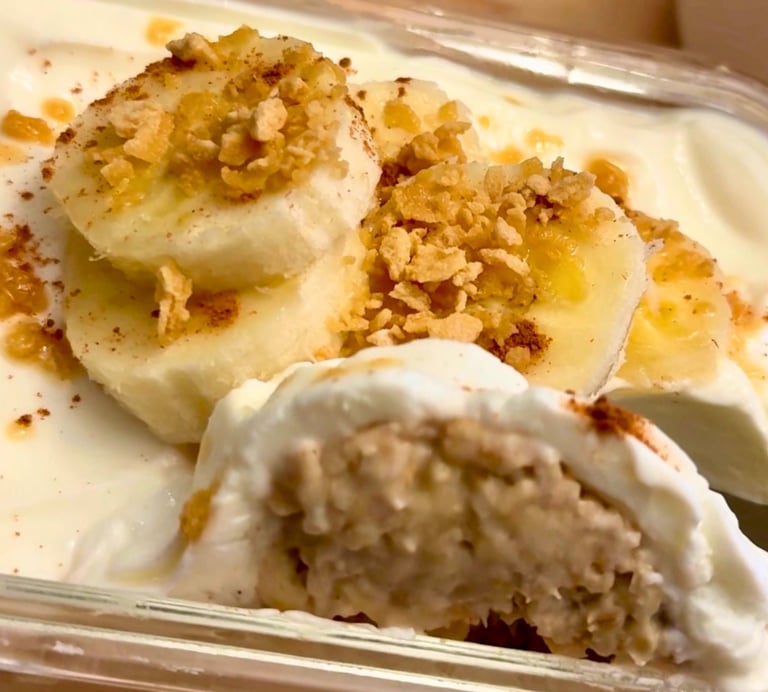 Por la mañana, mezcla y cubre con yogurt griego, rodajas de banano y miel de maple.